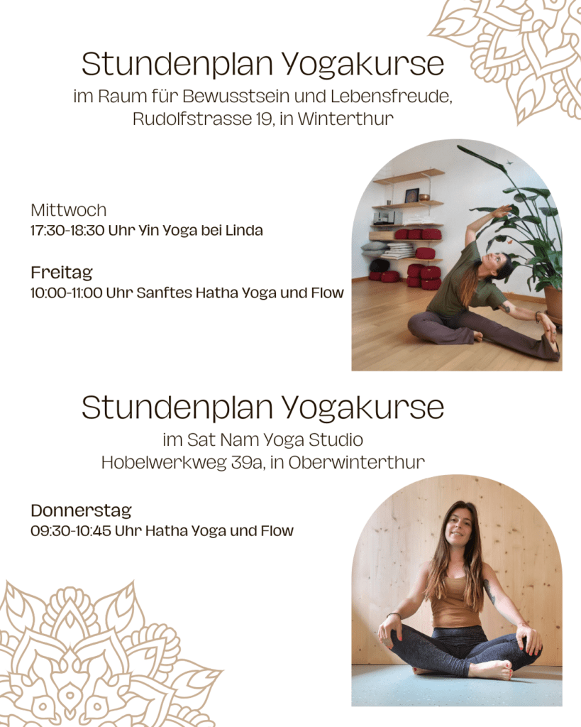 Auch in Oberwinterthur leitet Linda eine Yogalektion – jeweils am Donnerstagmorgen. Das Studio liegt gleich neben der Wohngenossenschaft «Hobelwerk» und heisst «Sat Nam Yoga Studio». Mit seiner liebevollen, heimeligen Einrichtung lädt es zum Wohlfühlen ein. Hier werden unterschiedliche Yogastile angeboten, unterrichtet von einer Vielfalt inspirierender Yogalehrpersonen. Hier sind Kurse auch einzeln buchbar. Alle Infos zu den Preisen etc. findest du auf satnamstudio.ch.